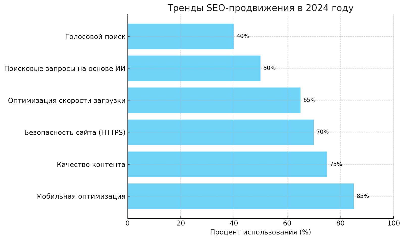 Вот диаграмма, демонстрирующая ключевые тренды мобильного SEO в 2024 году. Она отражает вклад различных аспектов, таких как адаптивный дизайн, голосовой поиск, локальный поиск, улучшение пользовательского опыта (UX/UI), AMP и безопасность (HTTPS).