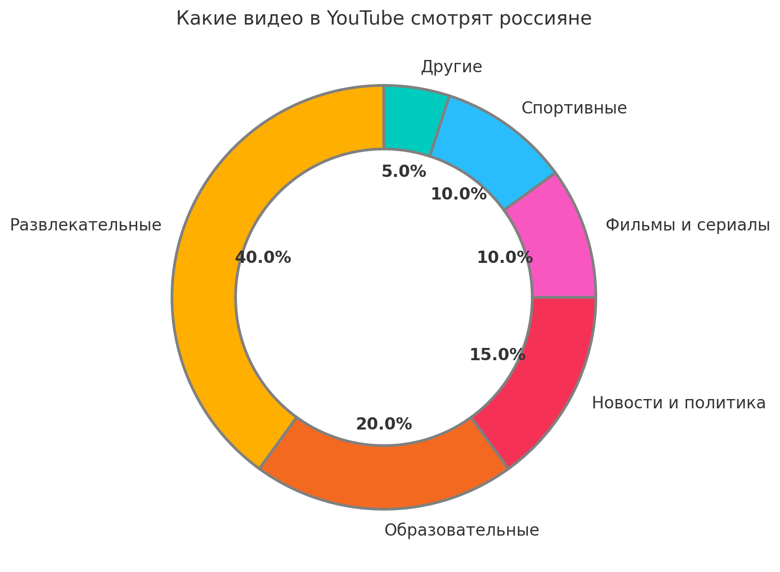На платформе YouTube россияне больше всего интересуются развлекательным контентом, в том числе музыкальными клипами и комедийными шоу. Образовательные и научно-популярные каналы также набирают популярность, особенно среди аудитории старше 25 лет.