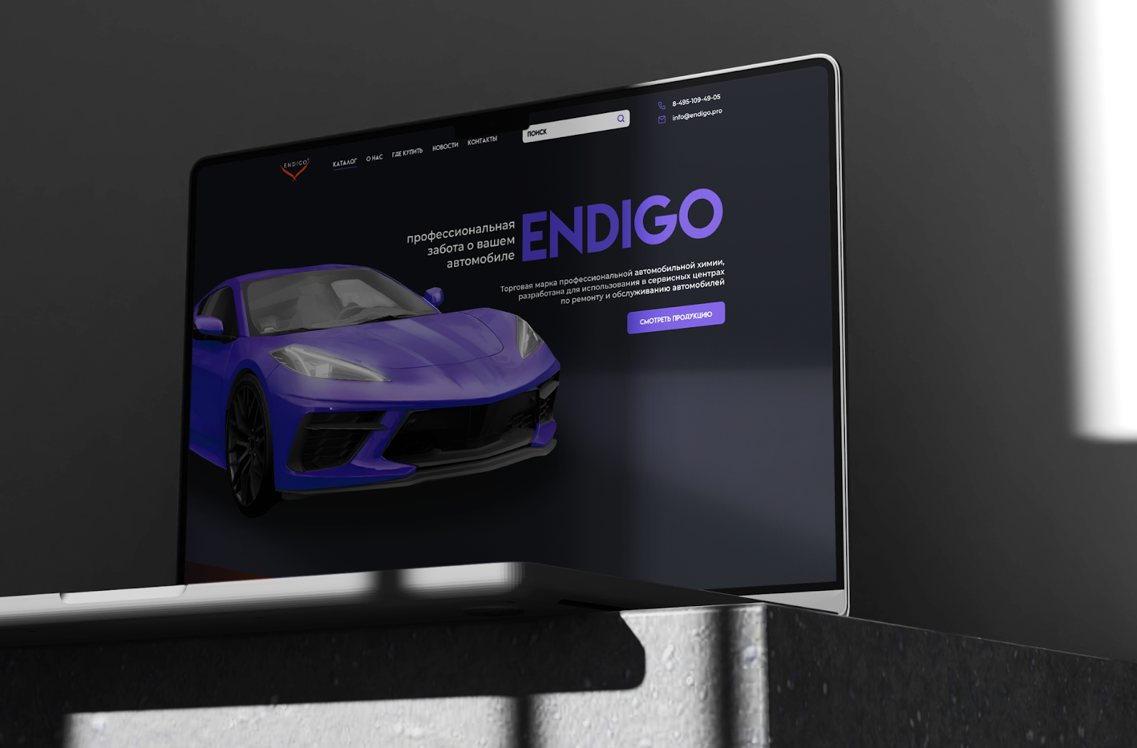 Логотип ENDIGO выделяется смелым градиентом, привлекая внимание и задавая тон всей концепции бренда. Шрифты в блоках текста выдержаны в минималистичном стиле — тонкие, четкие линии создают эффект современности и точности. Кнопка призыва к действию выполнена в стиле неонового свечения, гармонируя с общей цветовой гаммой и создавая тонкое ощущение интерактивности. Четкая структура меню в верхней части экрана подчеркивает функциональность и удобство навигации. Этот дизайн олицетворяет симбиоз технологий и стиля, демонстрируя профессиональный подход к деталям и высокий уровень визуальной эстетики.