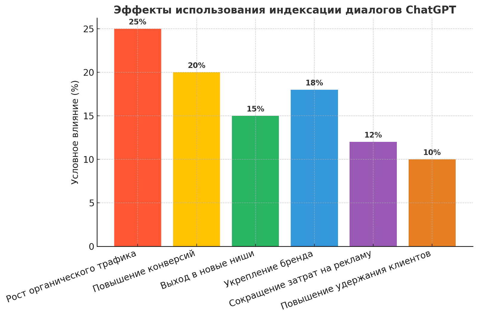Новый сегмент услуг: «SEO на основе ИИ-диалогов». Агентства интернет-маркетинга будут продавать готовые списки тем и контент-планы, построенные на основе анализа миллионов реплик пользователей в ChatGPT. Владельцам сайтов будут обещать, что это ускорит выход на рынок и позволит экономить бюджеты на тестирование гипотез.