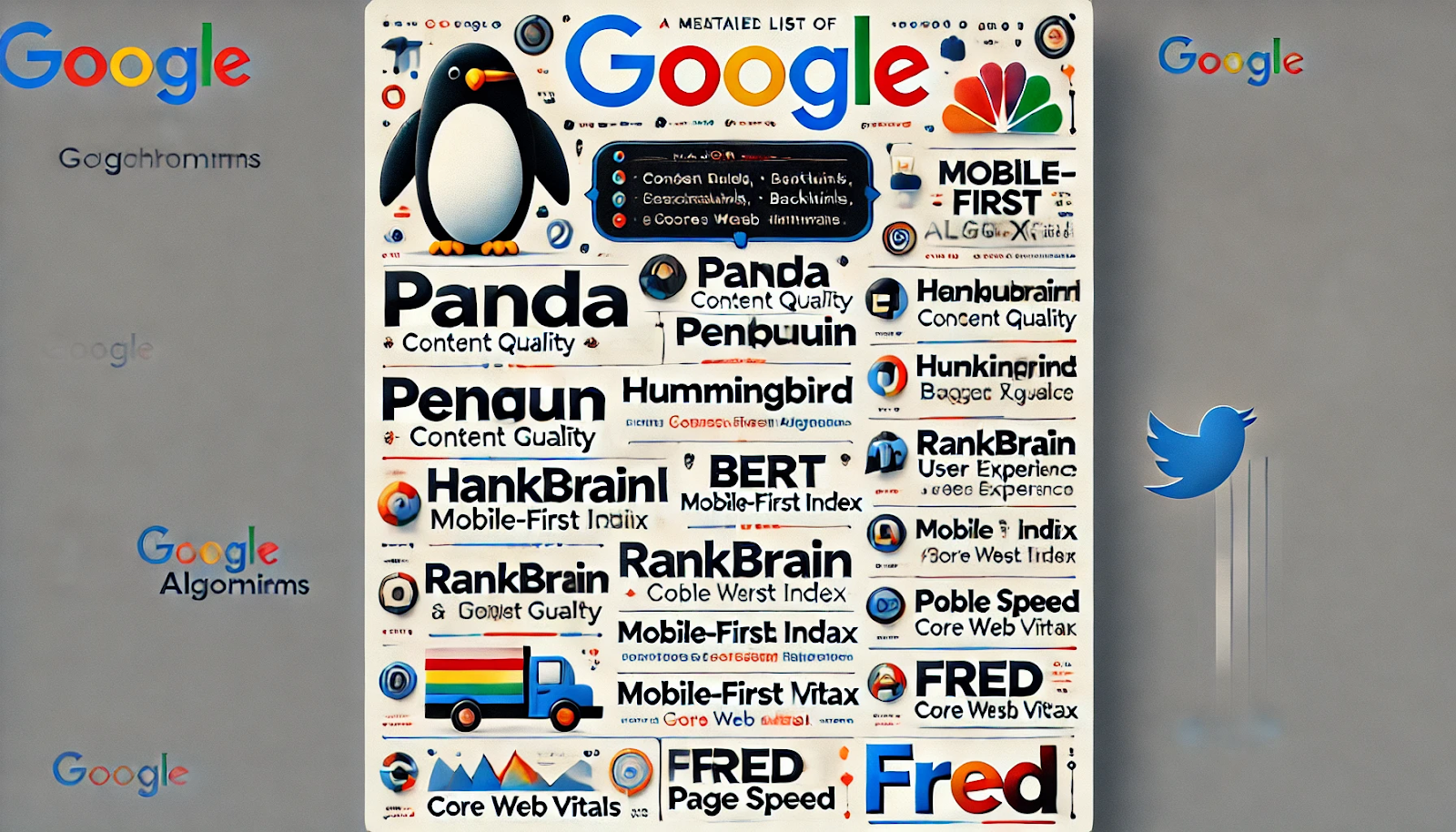 Основные обновления алгоритмов за последнее десятилетие включают Panda, Pirate, Hummingbird, RankBrain, обновление интерфейса страницы и систему полезного контента.